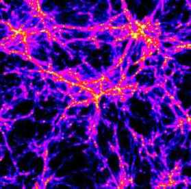 صورة للنسيج الكوني كما يبدو عبر السوبر كمبيوتر وهذه الصورة تمثل كوننا الذي نعيش فيه فهو عبارة عن شبكة من الخيوط النسيجية الكونية ولكن مادة هذه الخيوط هي المجرات.
