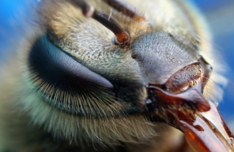 صورة بالألوان الحقيقية لعين النحلة وتظهر عليها أكثر من 30 ألف عدسة ضوئية فائقة!! مما يجعل النحلة ترى أفضل منا بكثير، ويحاول العلماء اليوم صنع كاميرا بعدسات تشبه عين النحلة، ولكنهم يقفون عاجزين أمام روعة التصميم الإلهي المحكم لهذه العين.