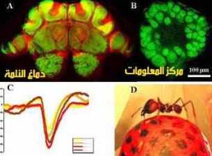 صورة حديثة لدماغ النملة!! A : صورة الدماغ كما يظهر بواسطة الفلور المشع. B : صورة للجزء الخاص بتحليل المعلومات في دماغ النملة. C : منحني يبين استجابة النملة لدى نشر رائحة معينة، حيث نلاحظ وجود نشاط في الدماغ تمثله القفزة في المنحني. D : اختبار للنملة بواسطة كرة إلكترونية تظهر ذكاء النمل وسرعة استجابته للمؤثرات.