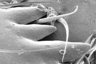 صورة لفك النملة، تستطيع به حفر الأرض ، وتستطيع القتال والدفاع عن نفسها، كما تستطيع أن تأكل وتمضغ الطعام! وتأمل معي هذا التصميم المعجز لفكي النملة، وإذا ما قارنا حجم فكي النملة بحجم فكي تمساح مثلاً نجد أن فك التمساح أكبر بآلاف المرات من فك النملة، ولكن فك النملة أقوى بكثير من فك التمساح قياساً إلى حجمها!!
