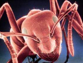 صورة لرأس النملة، هذا الرأس يحوي دماغاً معقداً تستطيع النملة به التفكير وإجراء الحسابات اللازمة، وإطلاق الإنذار لدى التعرض للهجوم! ونلاحظ وجود ستة أرجل وقرني استشعار أو هوائيين.